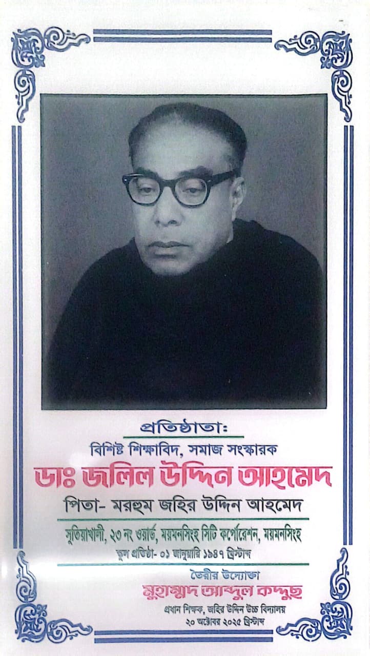 ময়মনসিংহ সিটি কর্পোরেশনের অন্তর্গত ২৩ নং ওয়ার্ডের সুতিয়াখালী জনপদের সম্ভ্রান্ত ফ্যামিলির সন্তান মরহুম ডাক্তার জলিল উদ্দিন আহমেদ এবং এই জনপদের শিক্ষানুরাগী ব্যক্তিবর্গের মহতি চিন্তার ফসল হিসেবে ০১ জানুয়ারি ১৯৪৭ খ্রিস্টাব্দে ডাক্তার জলিল উদ্দিন আহমেদ মহোদয়ের ঐকান্তিক প্রচেষ্টায় প্রতিষ্ঠাতা হিসেবে জহির উদ্দিন উচ্চ বিদ্যালয়টি প্রতিষ্ঠা করেছিলেন। এই জনপদকে অশি